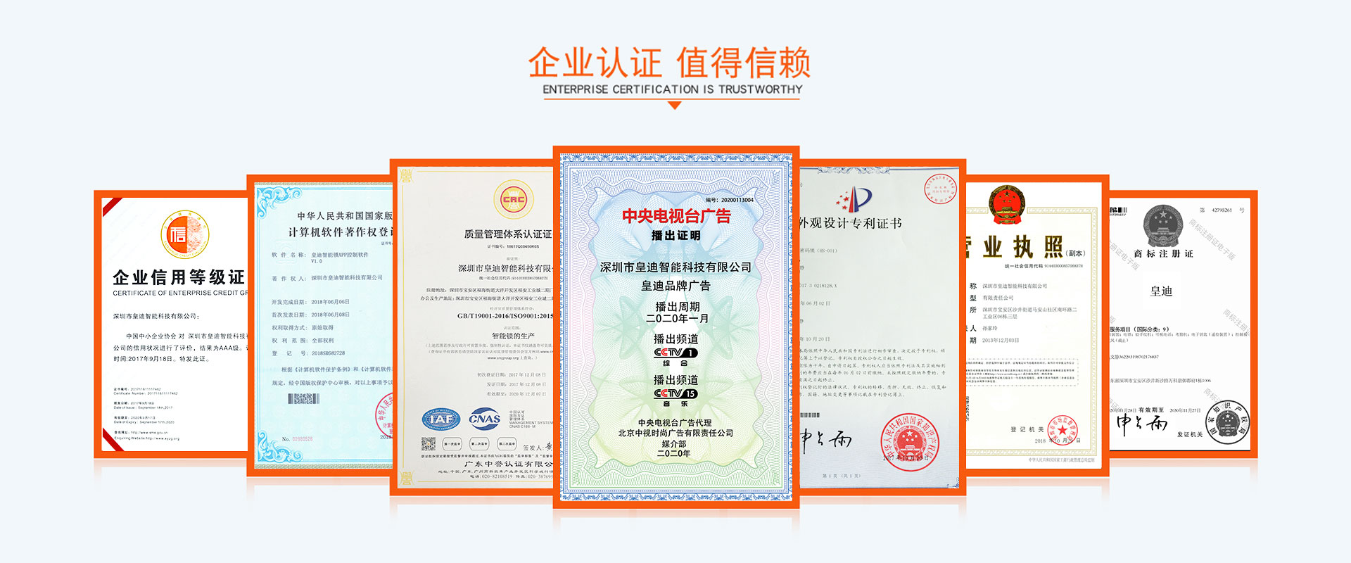 深圳市皇迪智能科技有限公司,是一家集產(chǎn)品研發(fā)、制造、銷(xiāo)售、安裝、售后于一體的全產(chǎn)業(yè)鏈公司,我司專(zhuān)注于酒店刷卡鎖、公寓藍(lán)牙密碼鎖、電子鎖、密碼鎖研發(fā),生產(chǎn),銷(xiāo)售.是國(guó)家高新技術(shù)企業(yè),公司已通過(guò)ISO9001/2015標(biāo)準(zhǔn)認(rèn)證,并擁有多項(xiàng)國(guó)家實(shí)用新型專(zhuān)利、外觀(guān)專(zhuān)利及計(jì)算機(jī)軟件著作權(quán); 皇迪玻璃門(mén)鎖廠(chǎng)家一直秉承“以顧客為中心,以人為本,長(zhǎng)期艱苦奮斗”的經(jīng)營(yíng)理念,為全球每一位消費(fèi)者提供舒適,便捷,安全的高品質(zhì)生活。
